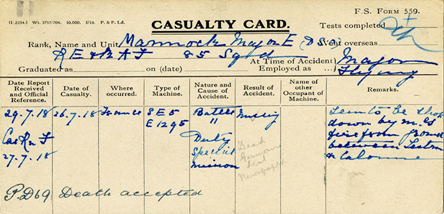 The RAF Museum holds an extensive set of record cards relating to deaths, injuries and illness suffered by Royal Flying Corps and Royal Air Force personnel (and ex-Royal Naval Air Service after 1 April 1918). The collection can be searched online at www.rafmuseumstoryvault.org.uk.